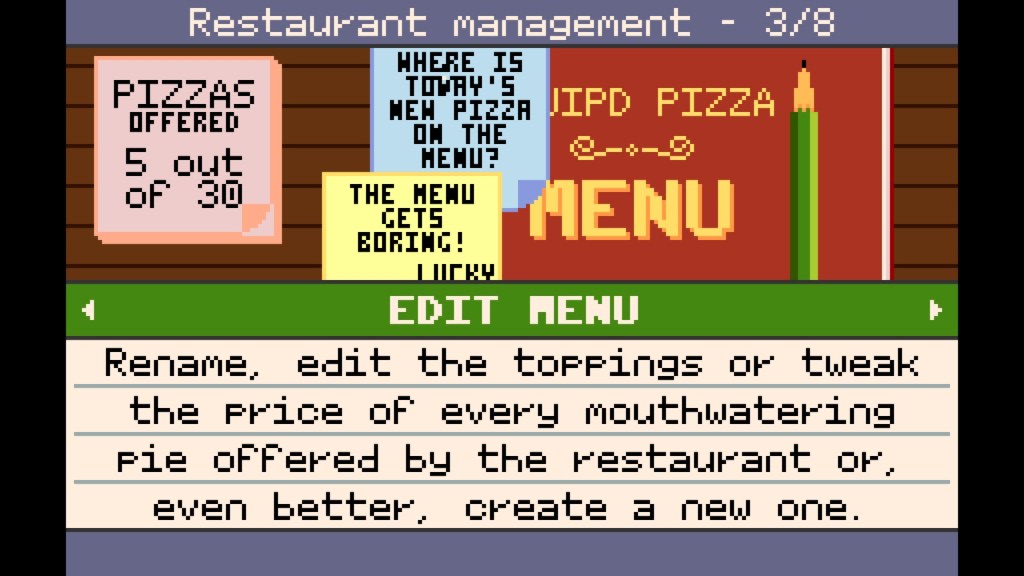 Items are customized within the menu system that will be explained via a tutorial. I’m not good at being patient and tend to skip through EVERYTHING I CAN on games. These tutorials are worth watching as they are quick and entertaining. Once you get the hang of it, you will enjoy changing out ingredients and coming up with new pizza-abominations and giving them awful names to serve up to your customers because they won’t care what it’s called or has on it. They just want their Yo Mamma pizza as fast as possible.